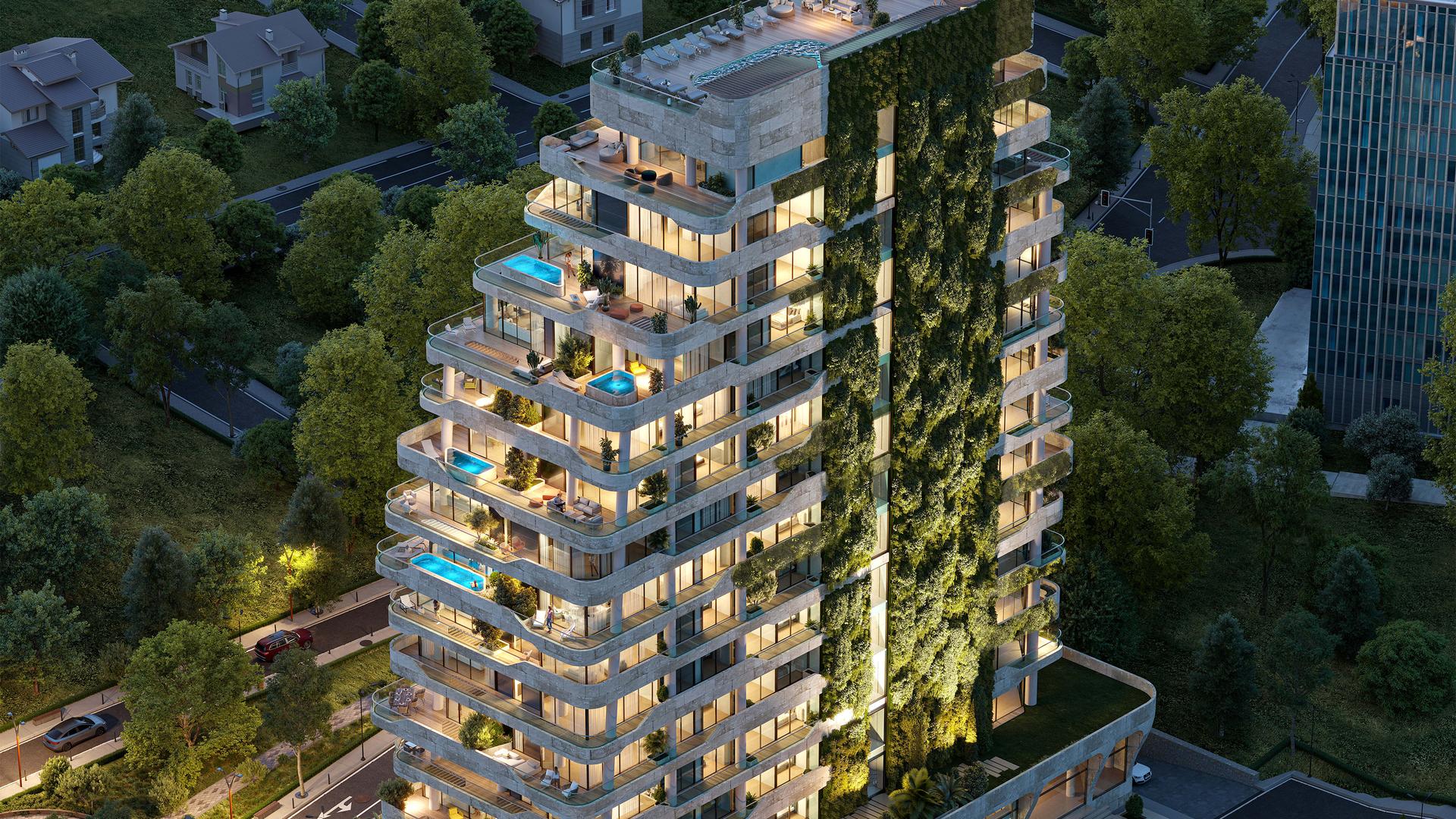 Polat Levent is a 14-story residential project in Istanbul's Levent district. The project integrates sustainability through biophilic design, natural stone facades, expansive balconies, and energy-efficient glass that maximizes daylight and ventilation. Green terraces and walls, water features, and landscaped areas enhance the microclimate and support well-being in urban living.
